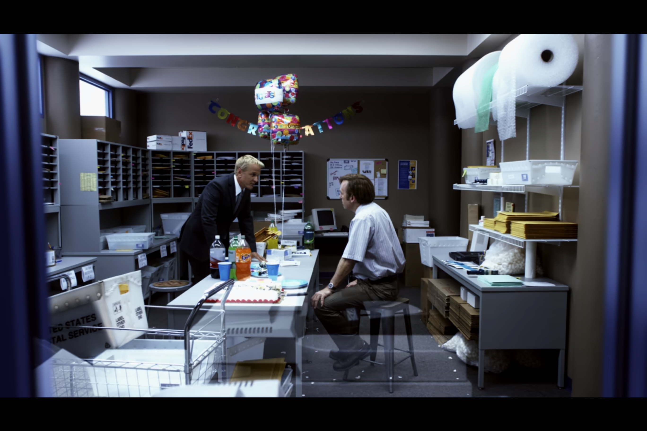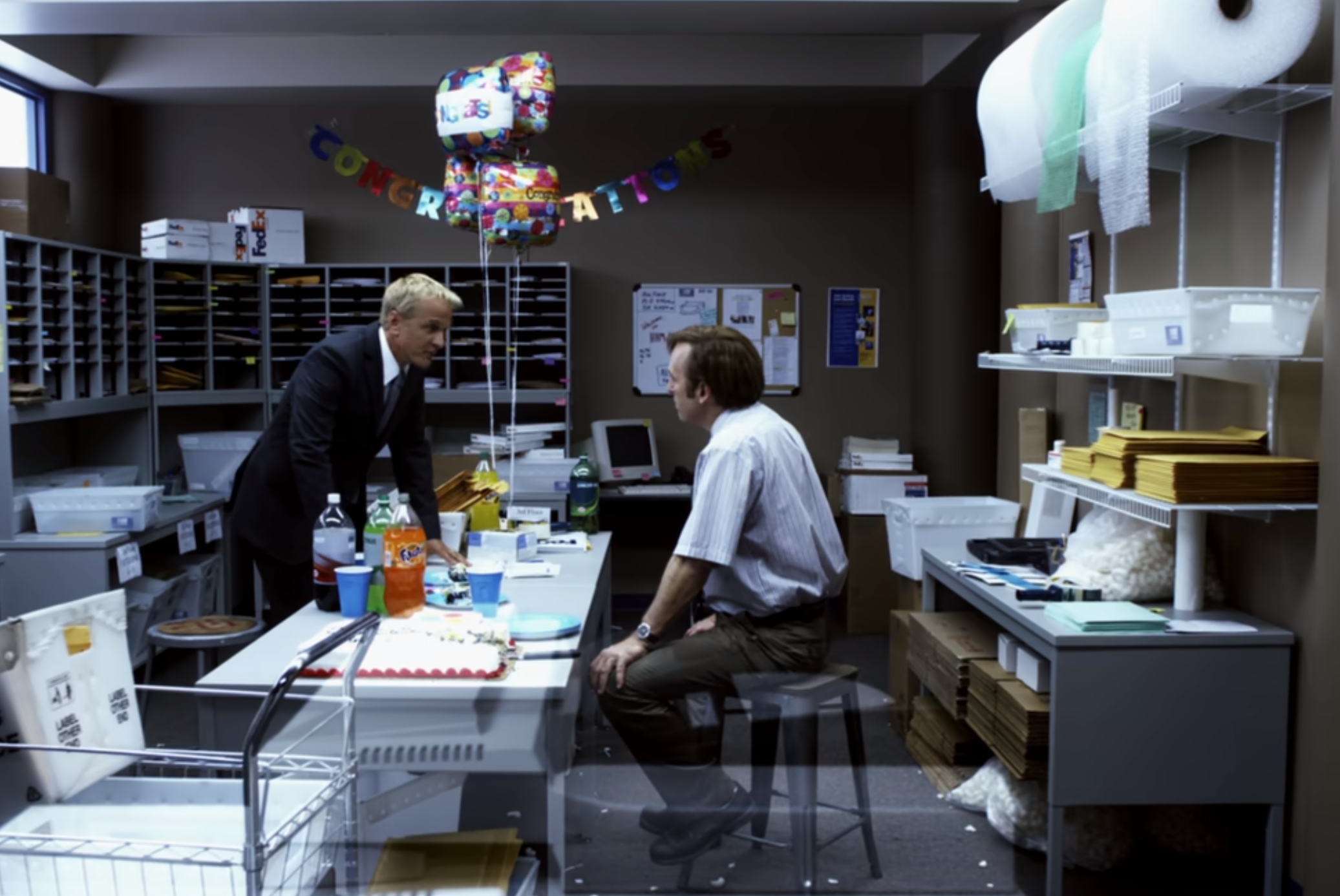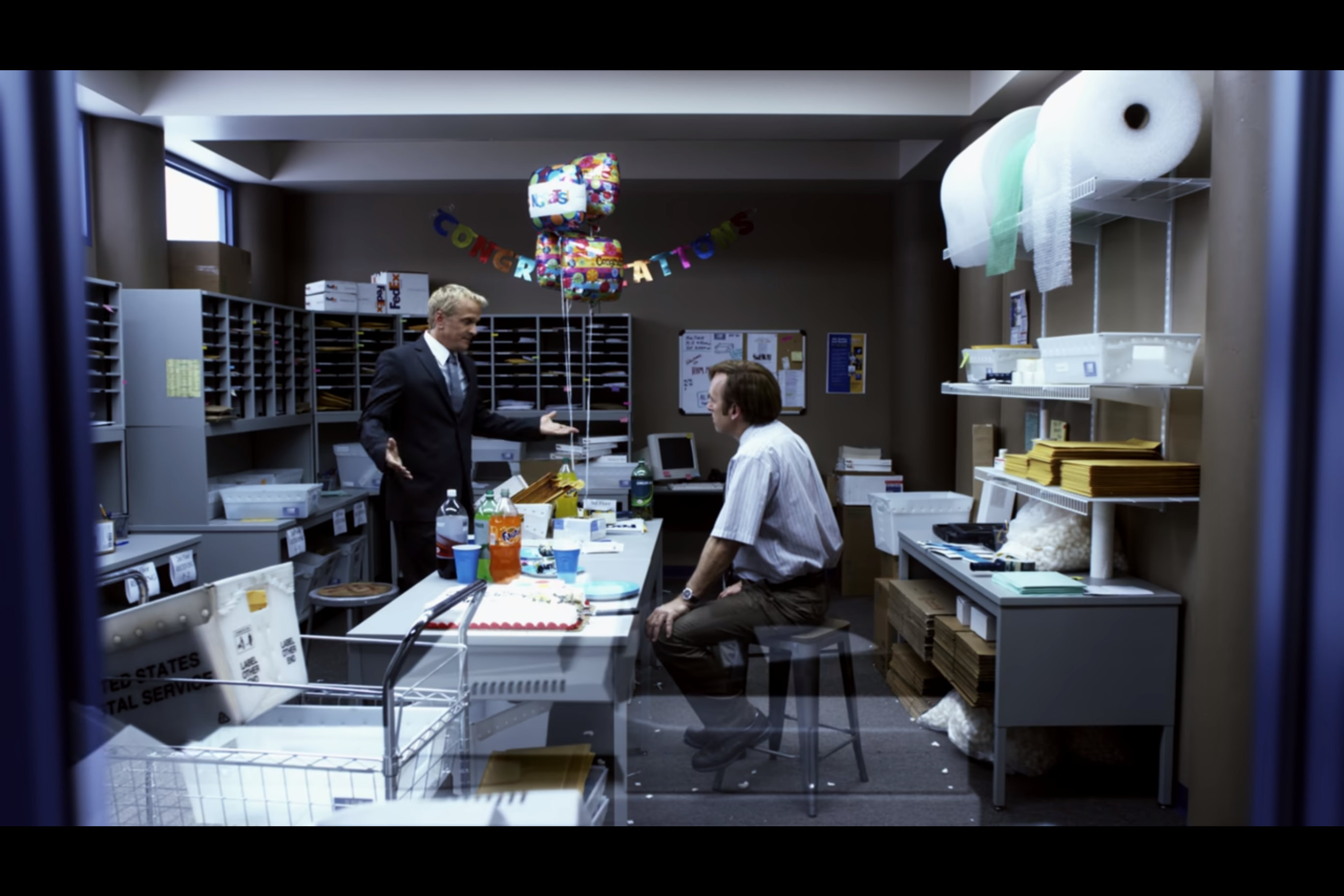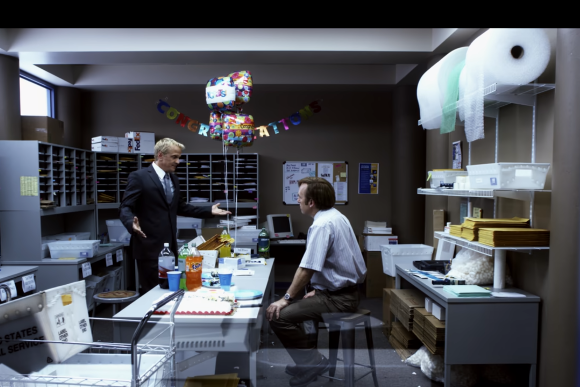 The show goes out of its way to avoid unnecessary exposition, when the point is to add dramatic effect and the viewer can anyway reasonably guess what is being said. In the scene below, we know exactly what happened – without hearing a word – that HHM chose not to hire Jimmy – based on context and body language.