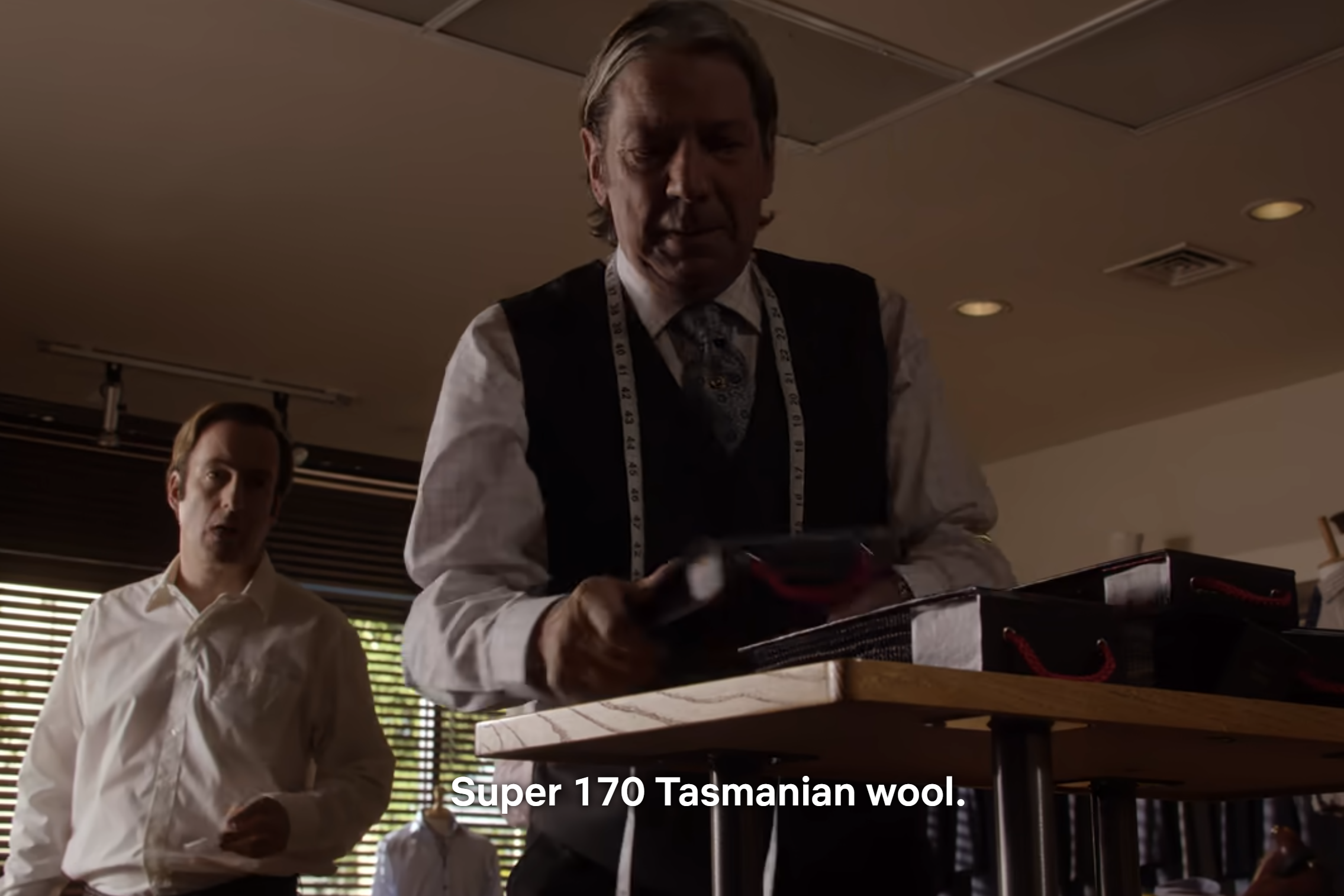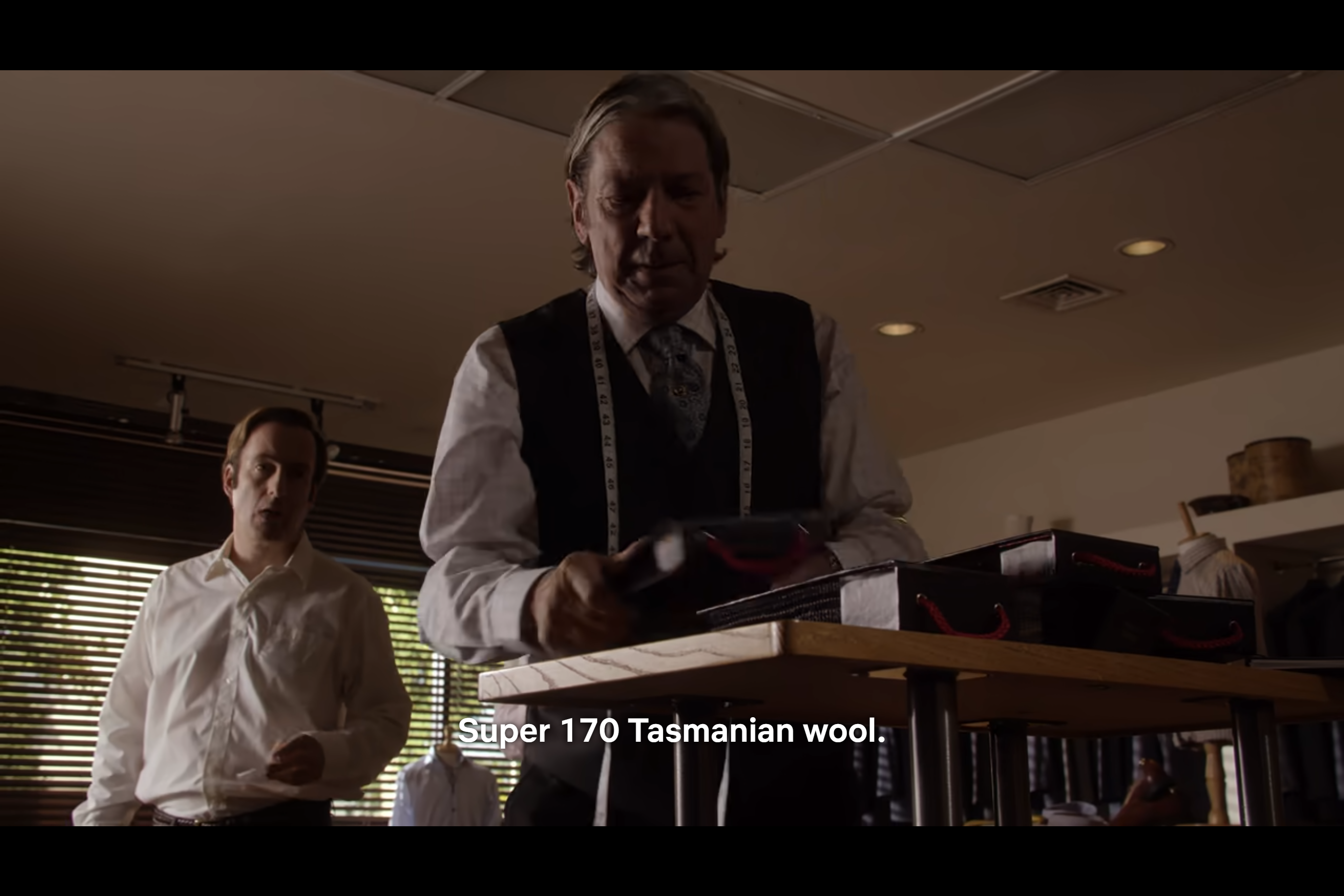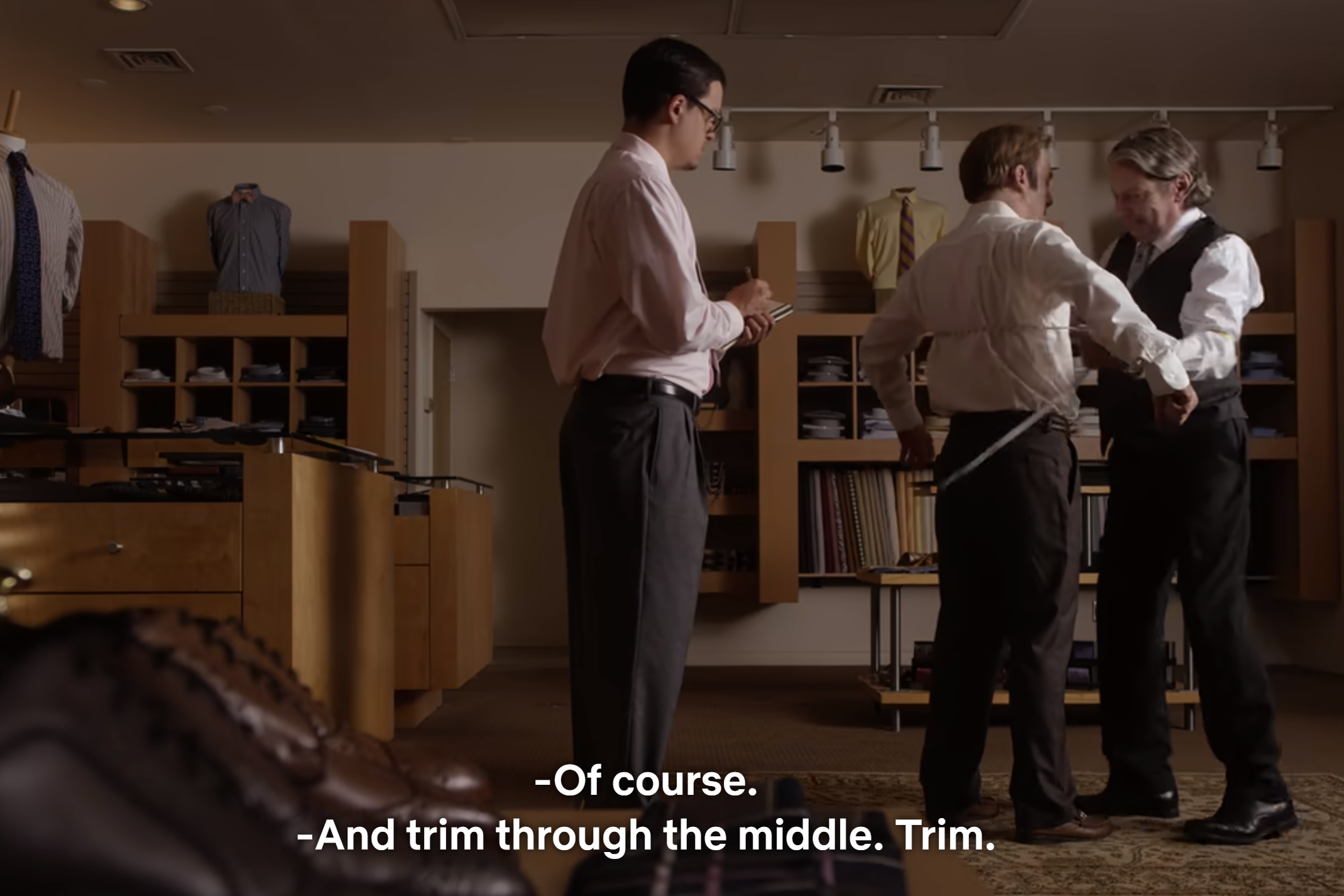 The first unique use of Show, Don’t Tell we see is in S01E04, where Jimmy has come into a bunch of money, and you see him at a high-end tailor. The requests, although specific, seem to be in good taste at first, just giving the impression that he’s treating himself with the finer things in life.