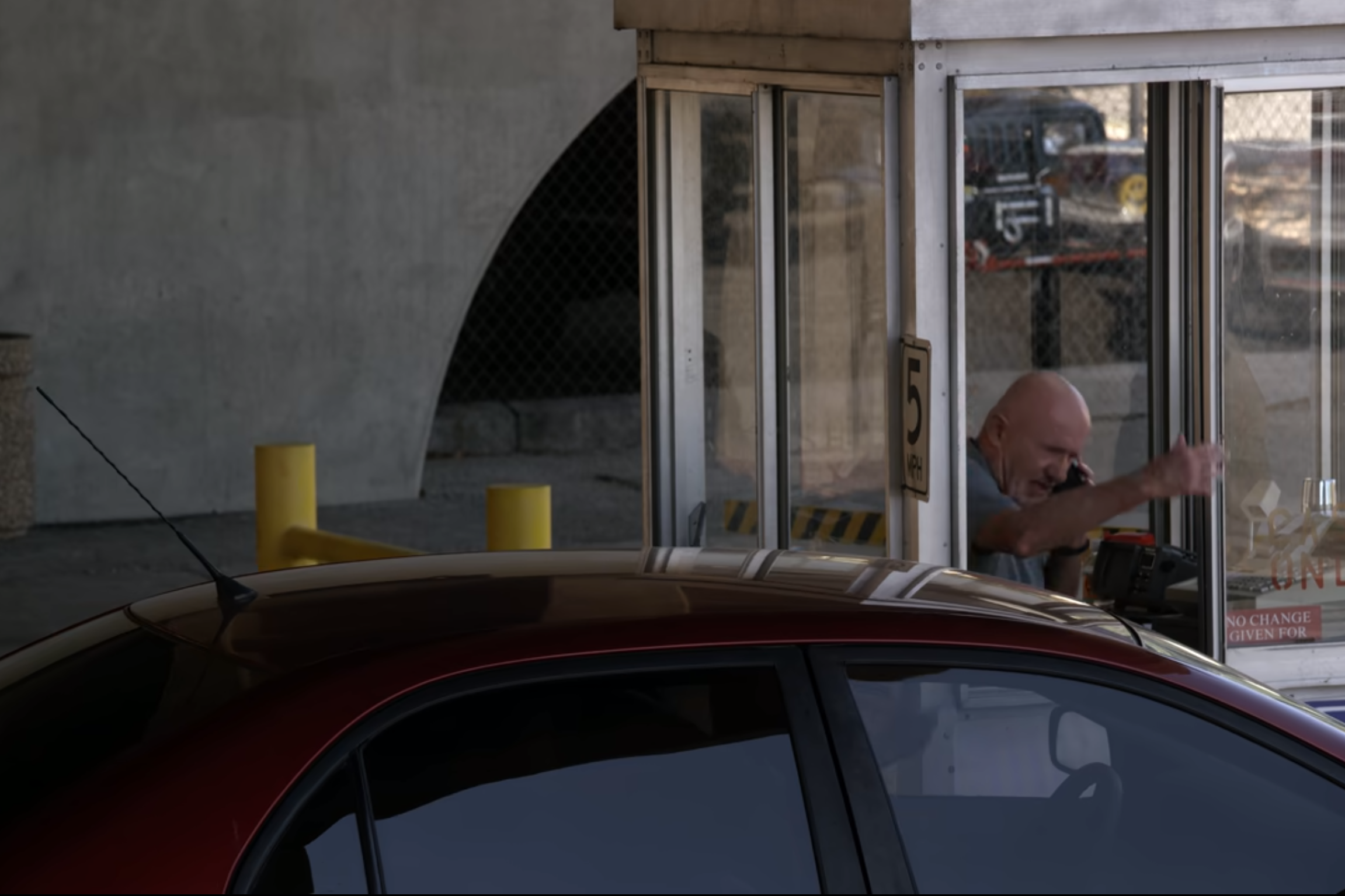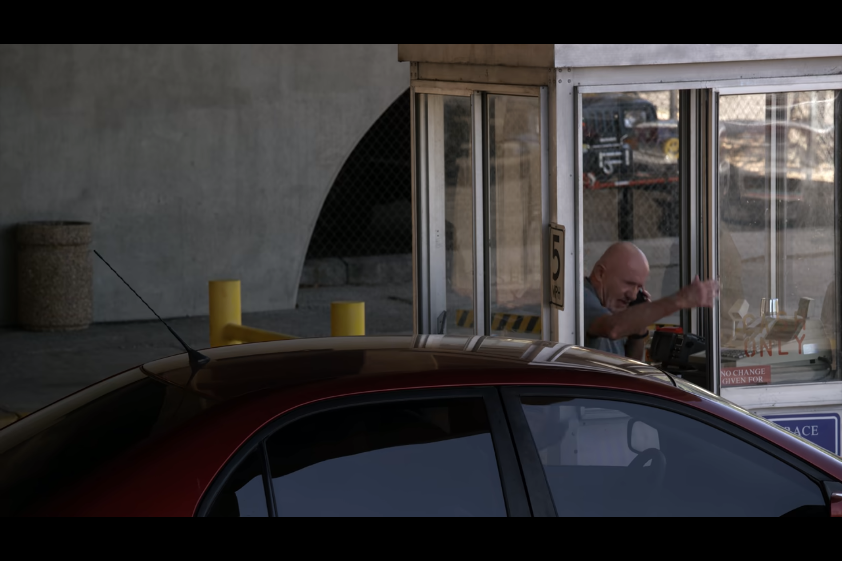 Here’s a ‘blink and you’ll miss it’ shot – Mike, usually stoic but firm about the rules at his parking attendant job, waves off a car without checking their fees because he’s on the phone and getting a chance to babysit his granddaughter.